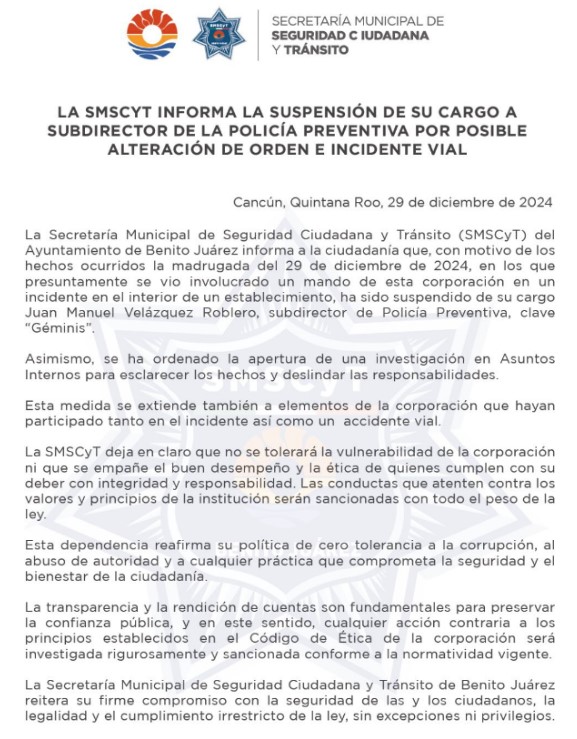 Cancún (Marcrix, Noticias).- La Secretaría Municipal de Seguridad Ciudadana y Tránsito (SMSCyT) de Benito Juárez suspendió al Subdirector de la Policía Preventiva, Juan Manuel Velázquez Roblero, conocido como “Géminis”, por su presunta participación en un altercado dentro de un bar y en un accidente vial ocurrido la madrugada de este domingo.