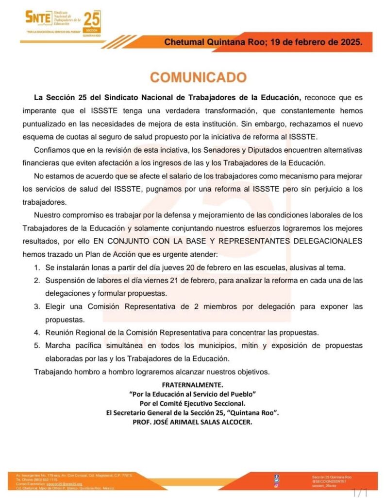 A partir de este jueves los maestros colocarán mantas de protesta en las escuelas, el viernes habrá suspensión de actividades y el sábado movilizaciones en todo Quintana Roo para protestar contra la iniciativa que ingresó el 7 de febrero pasado la Presidenta de México la Ley del ISSSTE, y que fue aprobada con celeridad siete días después.