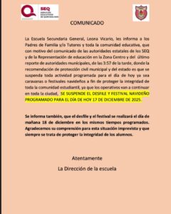 Felipe Carrillo Puerto (Marcrix Noticias).– El festival y desfile navideño de la Escuela Secundaria General “Leona Vicario” fueron suspendidos este miércoles 17 de diciembre, luego de los hechos violentos registrados horas antes en la ciudad, que derivaron en un fuerte operativo de seguridad y la activación de recomendaciones preventivas por parte de las autoridades.