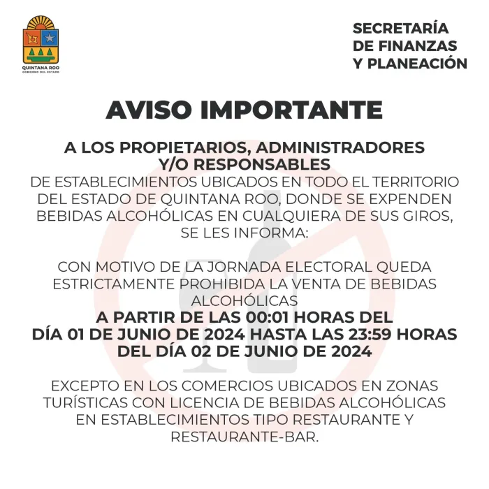 Chetumal (Marcrix Noticias)- Con la finalidad de asegurar el orden y garantizar el desarrollo de la jornada electoral del próximo 2 de junio; en cumplimiento a las leyes de la materia, la Secretaría de Finanzas y Planeación (SEFIPLAN), decretó la suspensión temporal para la venta de bebidas alcohólicas para este fin de semana.