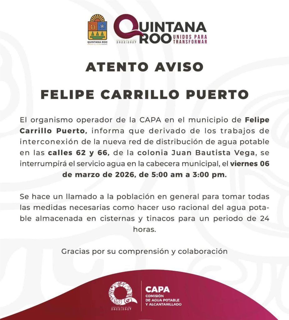 Felipe Carrillo Puerto (Marcrix Noticias).– La Comisión de Agua Potable y Alcantarillado (CAPA) informó que este viernes 6 de marzo se suspenderá temporalmente el servicio de agua potable en la cabecera municipal de Felipe Carrillo Puerto, debido a trabajos de interconexión de una nueva red de distribución.