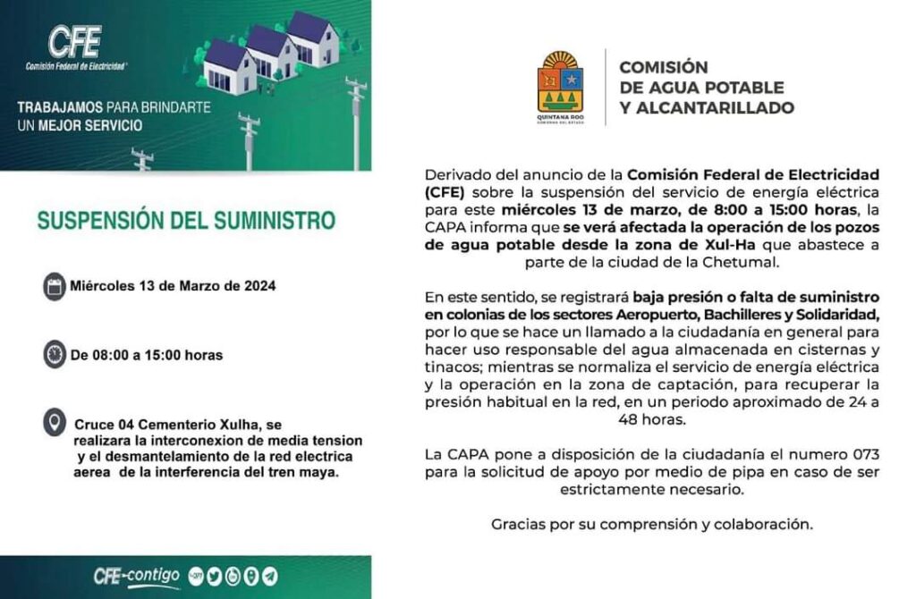 Chetumal (Marcrix Noticias).- Debido a la interrupción del servicio de energía eléctrica en la planta generadora de Xul-Ha que abastece a la ciudad de Chetumal, también se suspenderá el suministro de agua potable.