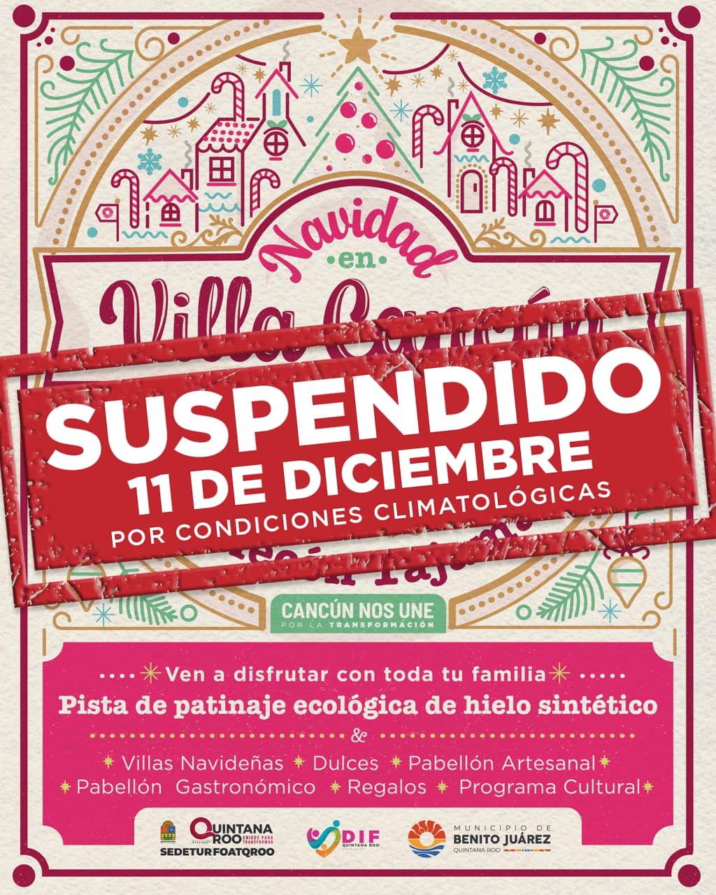 El Ayuntamiento de Benito Juárez informa que, debido al mal clima, las actividades de Villa Cancún en Malecón Tajamar quedan suspendidas este día.