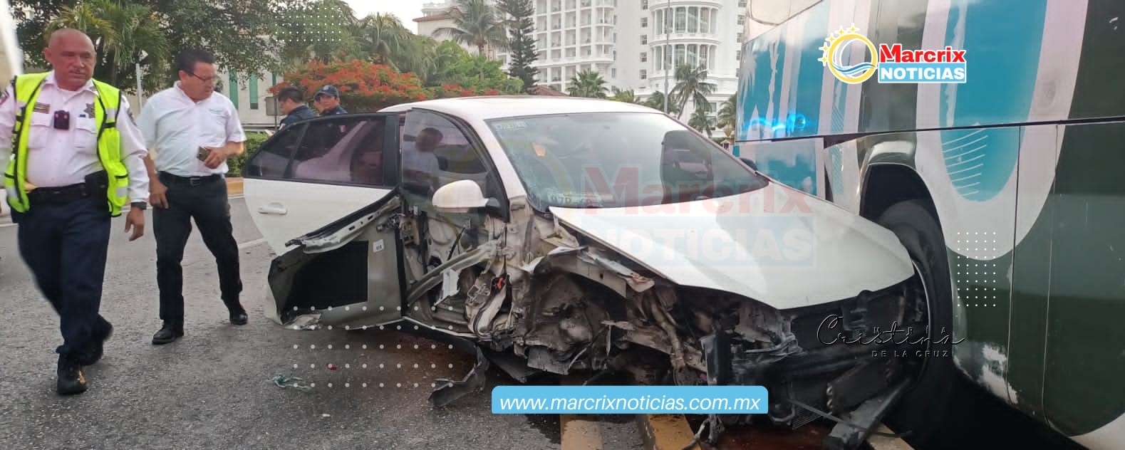 Dos lesionados Cancún (Marcrix Noticias).— Un automóvil compacto marca VW se impactó en el costado de un autobús turístico en la zona hotelera de Cancún, con saldo de dos lesionados.…