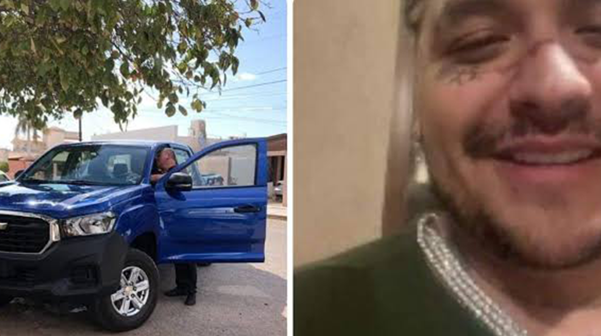 Nodal dio por cumplida su promesa regalándole a su antiguo maestro un carro Chevrolet tipo pick-up de color azul
