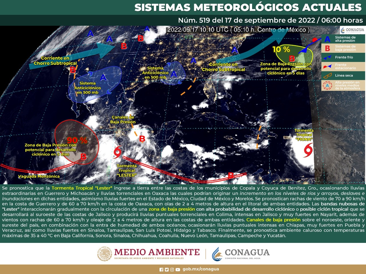 La vaguada térmica (canal de baja presión) ubicada en superficie sobre la porción Sur del Golfo de México se mueve lentamente al Oeste, se asocia con los remanentes de la…