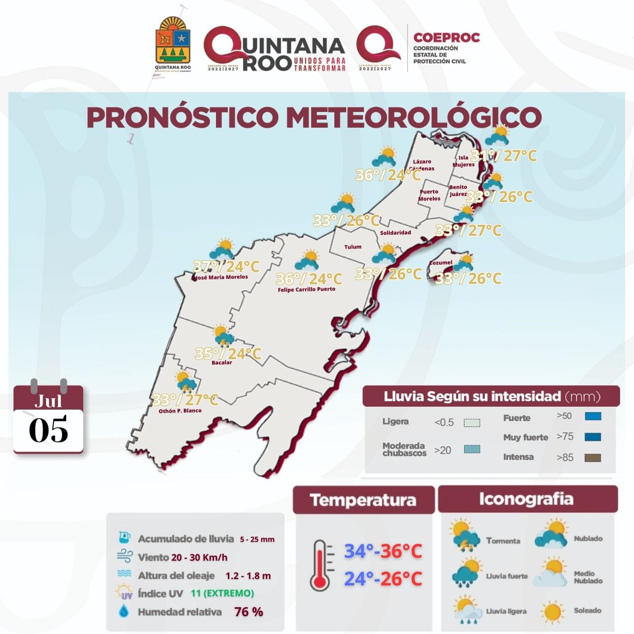 Jueves caluroso con intervalos de chubascos en Quintana Roo