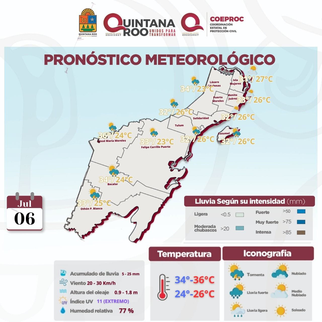 A pesar de los chubascos, seguirá predominando el calor durante el transcurso del día en el Caribe mexicano.