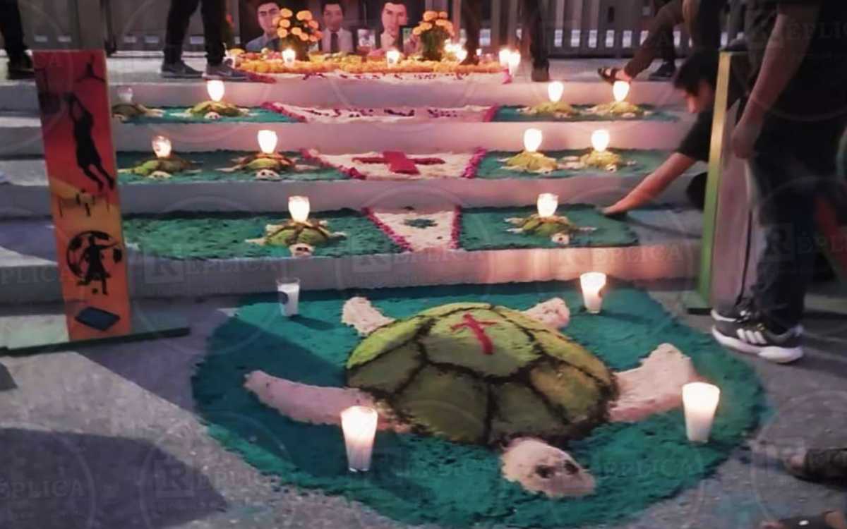 A propósito de la celebración del Día de Muertos, estudiantes de la normal Raúl Isidro Burgos, colocaron un altar para exigir verdad y Justicia sobre sus compañeros asesinados y desaparecidos