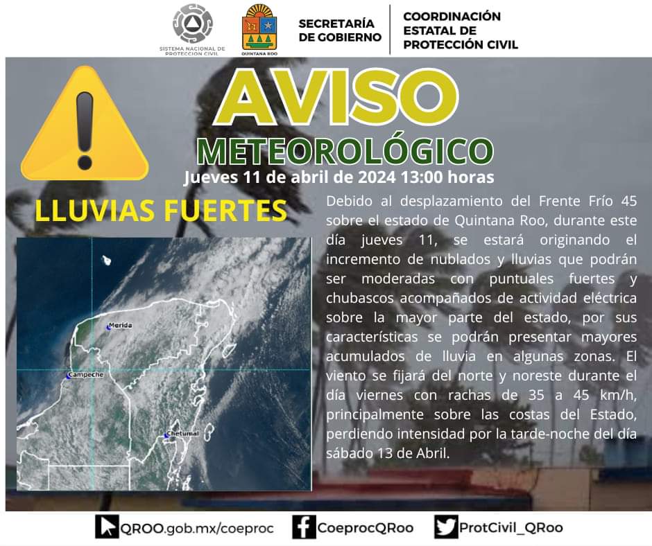 Los efectos del Frente Frío 45 se empezarán a sentir en Quintana Roo a partir de este jueves 11 de abril, informó Protección Civil.