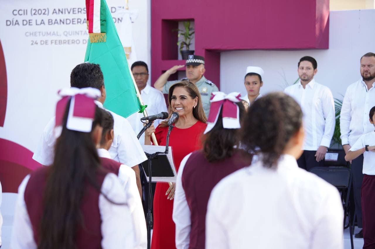 Encabeza la ceremonia conmemorativa del Día de la Bandera acompañada de alumnos distinguidos de diferentes niveles educativos