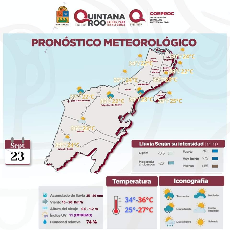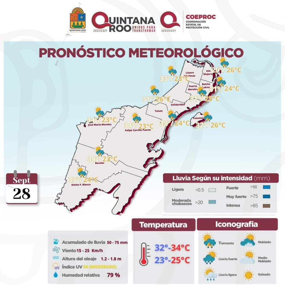 Se tiene previsto que las lluvias sean fuertes y estén acompañadas de actividad eléctrica en la mayor parte de Quintana Roo.