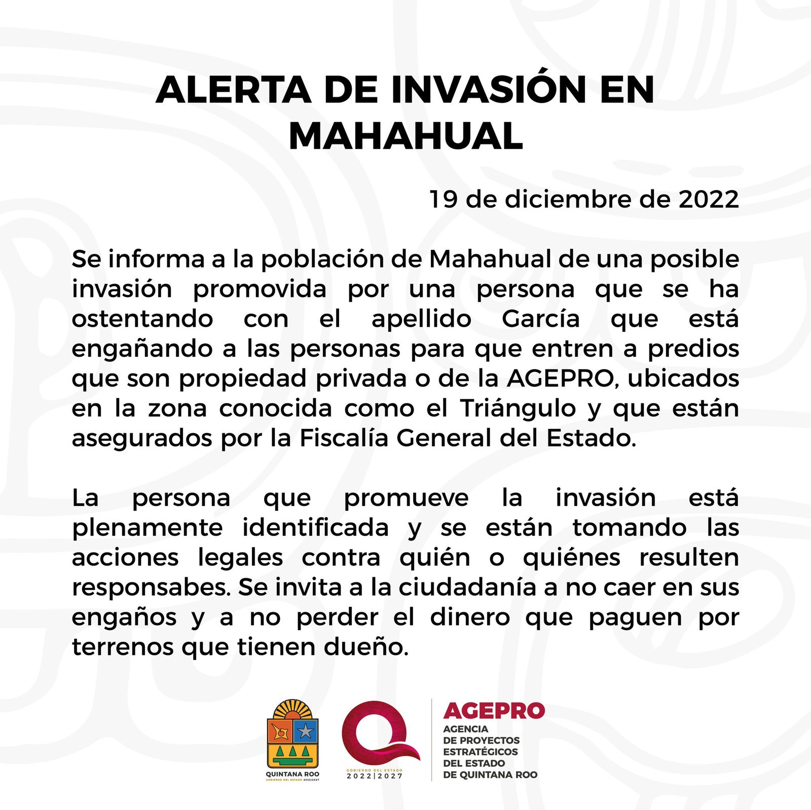 Insta a la ciudadanía a no caer en engaños Cancún (Marcrix Noticias).— El gobierno de Quintana Roo alertó a la ciudadanía de una invasión ilegal de terrenos en Mahahual de…