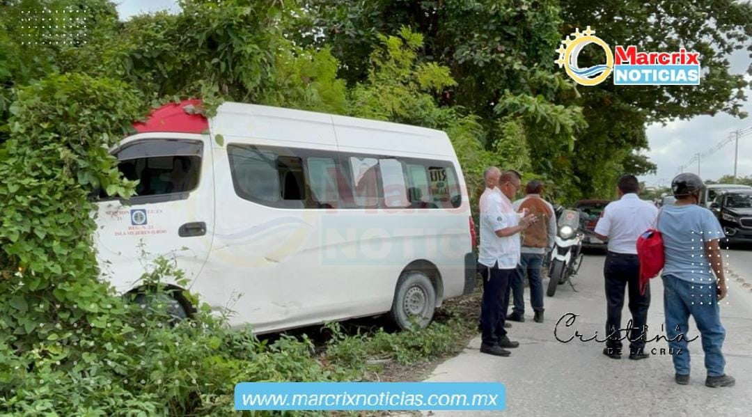 Por querer rebasar, terminó perdiendo el control de la unidad y terminó incrustado en la maleza; una pasajera fue llevada al hospital.