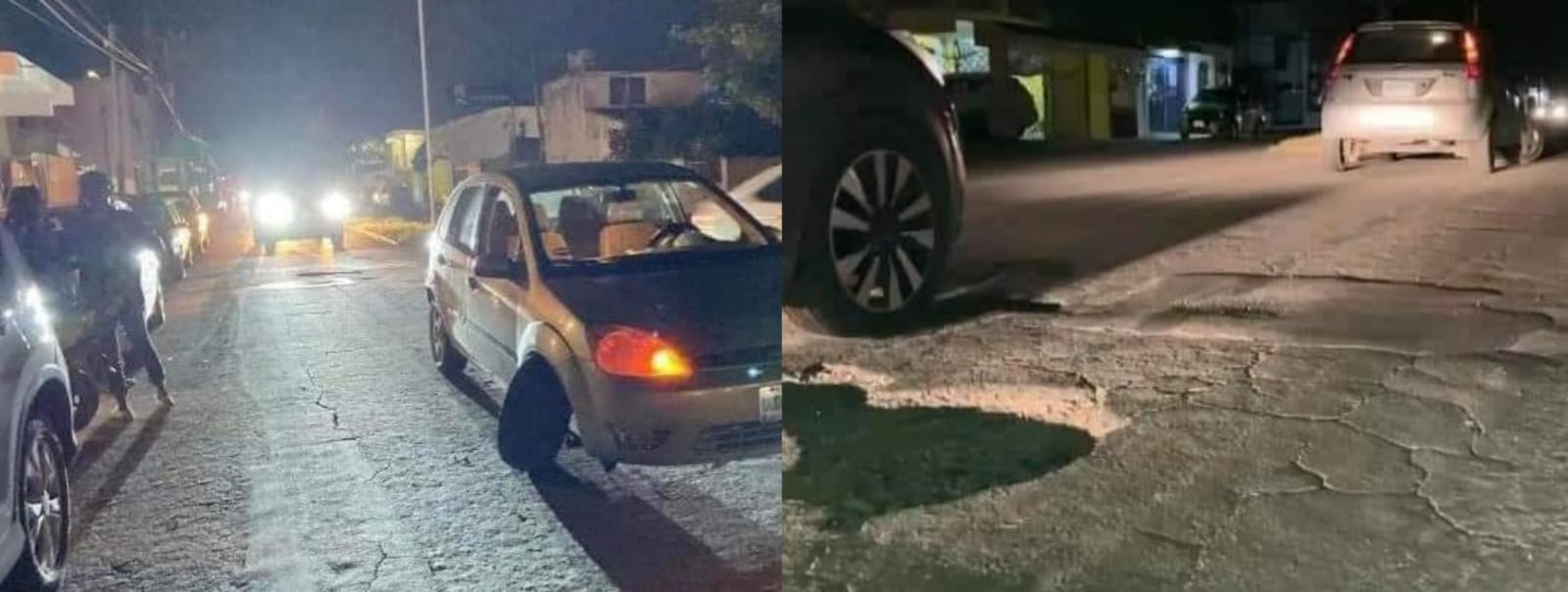 Uno de los tantos baches que hay en Chetumal ocasionó que la llanta y la suspensión de un automóvil quedaran destrozadas.