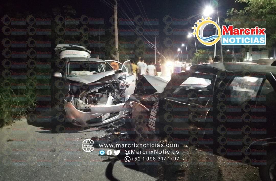 El choque entre una camioneta CX-5 y un automóvil tipo Versa ocasionaron cuantiosos daños materiales en el cruce de la avenida México con Nichupté.