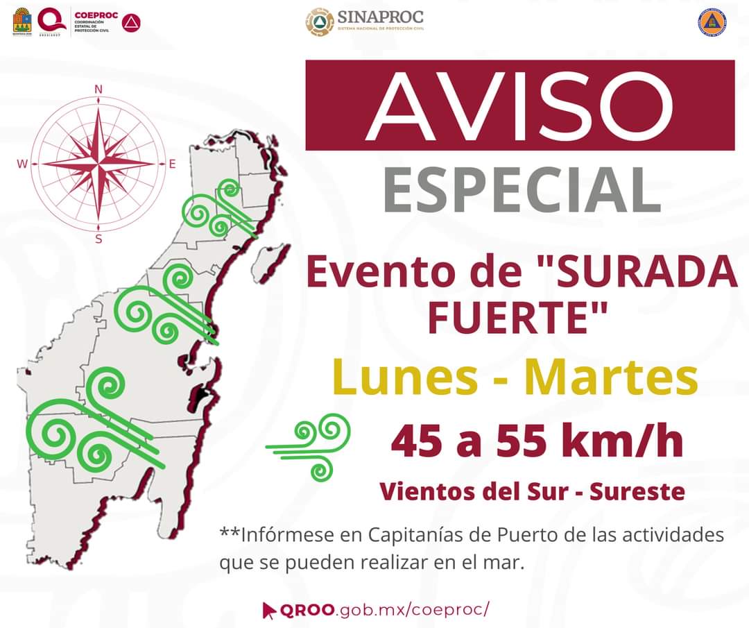 Protección Civil señala que se presentarán vientos muy fuertes, principalmente en las zonas costeras de Quintana Roo.