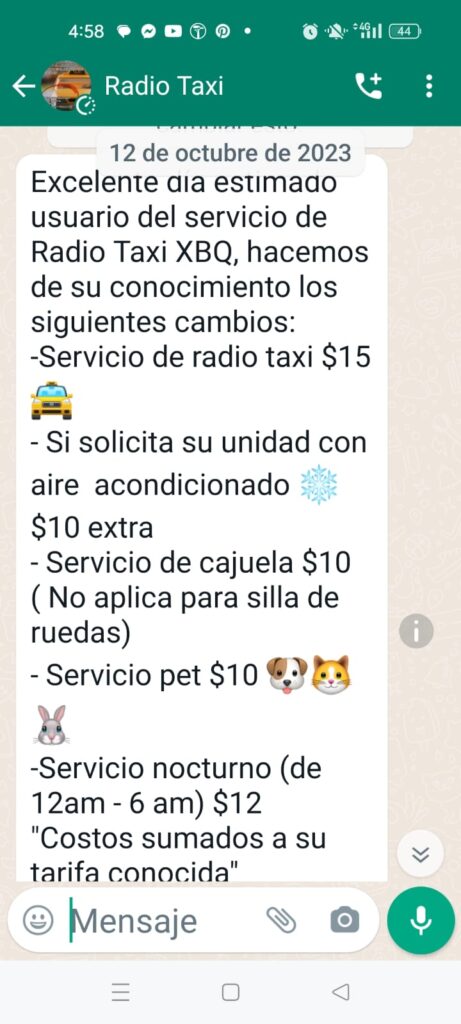 La agrupación “Radio Taxi” perteneciente al SUCHAA, que desde hace más de 20 años da servicio a domicilio vía telefónica, tenía un costo adicional de $10.00 pesos por viaje más la tarifa respectiva apenas en septiembre 2023, sin embargo, repentinamente empezaron a señalar que este servicio especial subiría a $15.00 y una serie de condicionantes más, ente estás el uso de la cajuela y el aire acondicionado.