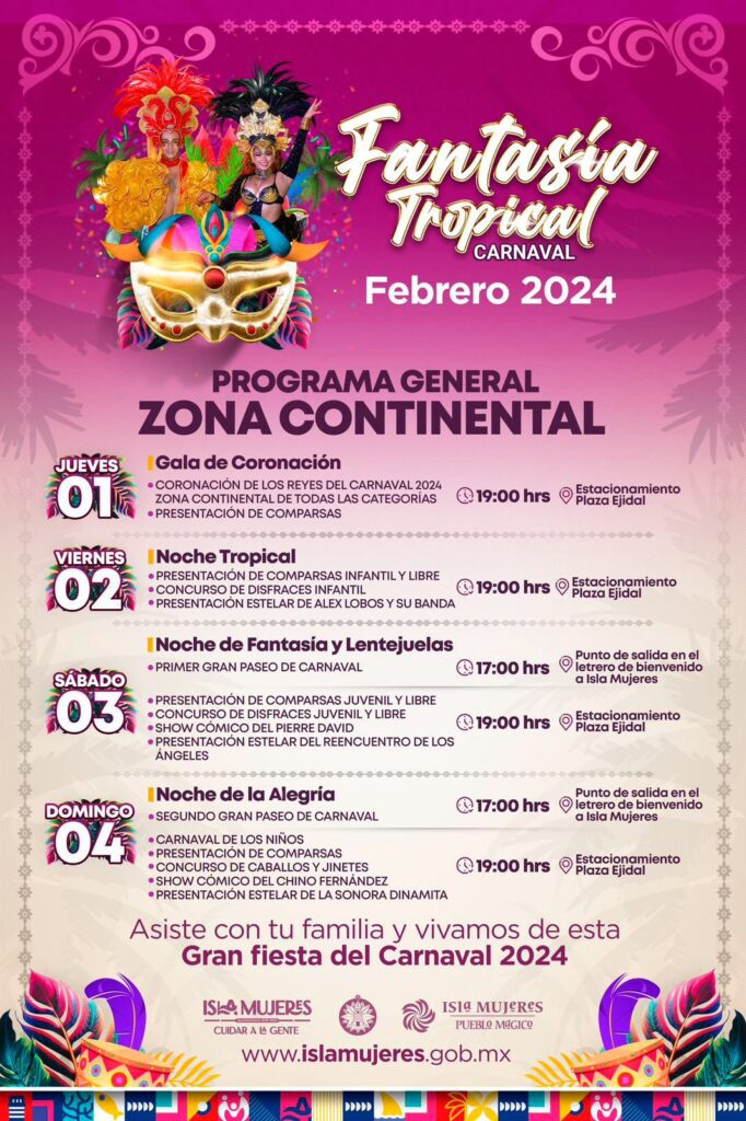 El 3 de febrero las familias isleñas de la Zona Continental disfrutarán de la Noche de Fantasía y Lentejuelas con el primer Gran Paseo de Carnaval que saldrá a las 17:00 horas en el letrero de bienvenido a Isla Mujeres, enseguida se presentarán las Comparsas y el Concurso de Disfraces en las categorías Juvenil y Libre, el show cómico de Pierre David y la exhibición estelar del reencuentro de Los Ángeles a partir de las 19:00 horas en el estacionamiento de la Casa Ejidal.