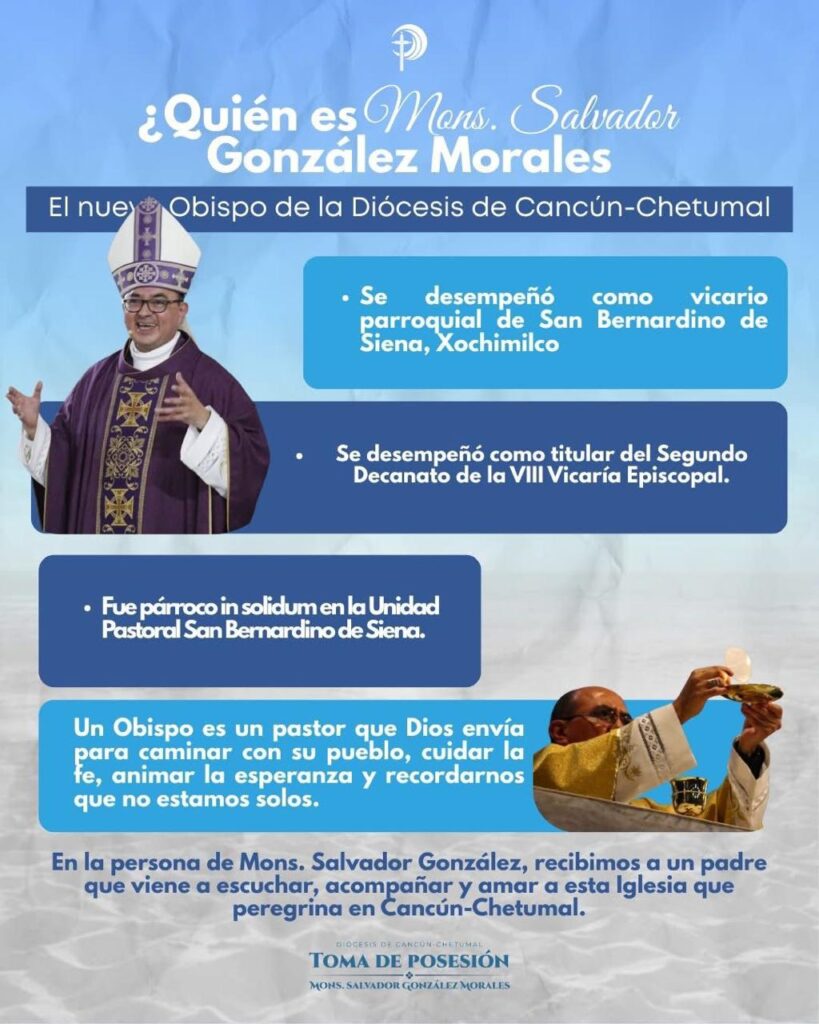 Cancún (Marcrix Noticias).– La Diócesis de Cancún-Chetumal dio a conocer los detalles de la Celebración Eucarística de Toma de Posesión de Monseñor, Salvador González Morales como II Obispo de la Diócesis, un acto que reunirá a más de 2 mil fieles, así como a cardenales, obispos, sacerdotes, religiosas, autoridades civiles y representantes del Episcopado Mexicano.