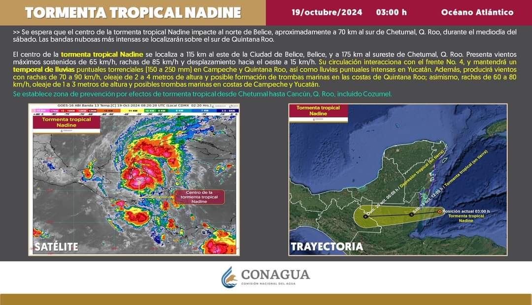 Cancún(Marcrix Noticias).- Se espera que el centro de la Tormenta Tropical Nadine impacte al Norte de Belice, aproximadamente a 70 km al Sur de Chetumal, Quintana Roo, durante el mediodía del sábado.