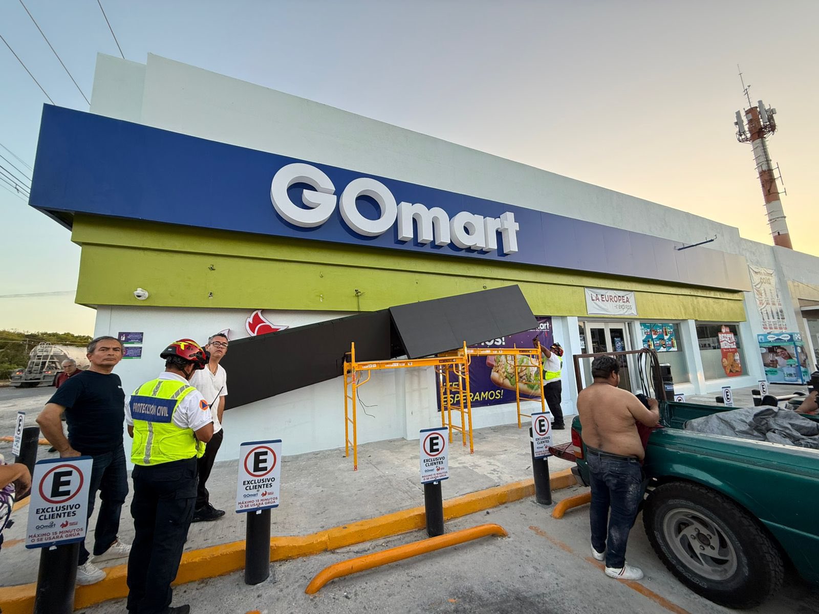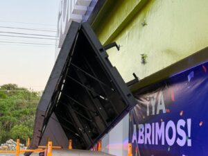 Playa del Carmen.- Dos trabajadores resultaron lesionados la mañana de este miércoles, tras caerles encima dos pantallas publicitarias, mientras las instalaban en la fachada de la tienda Gomart, ubicada en la colonia El Tigrillo, sobre el bulevar Playa del Carmen, cerca de la agencia Toyota.