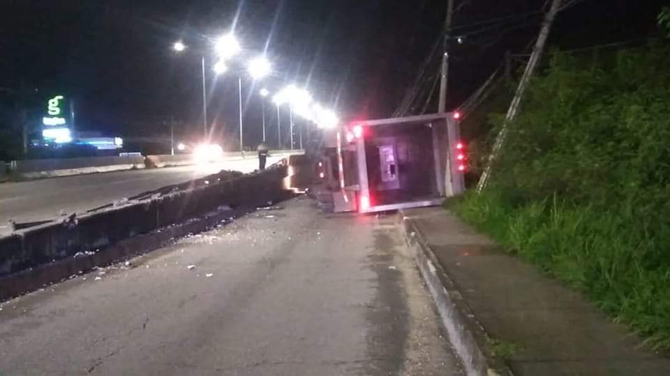Puerto Aventuras(Marcrix Noticias).- Un aparatoso accidente se registró durante la noche de ayer en el municipio de Solidaridad, donde un tráiler terminó cayendo de un puente vehicular.