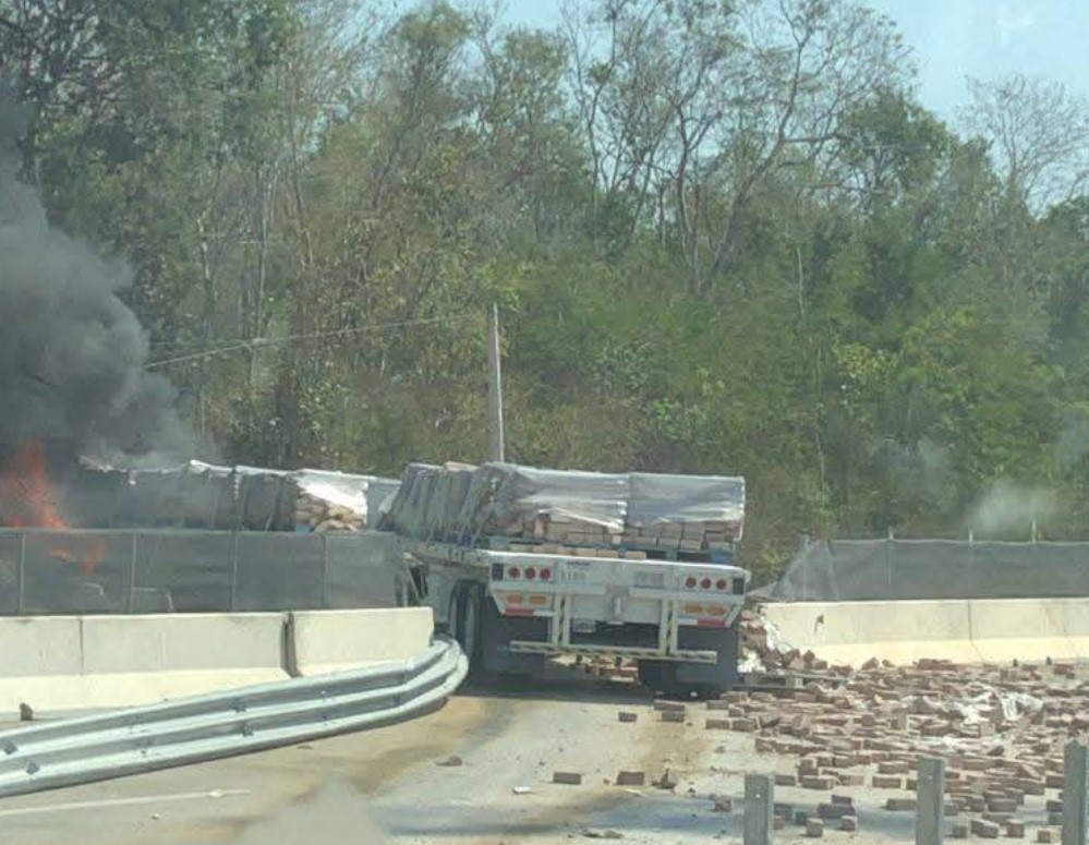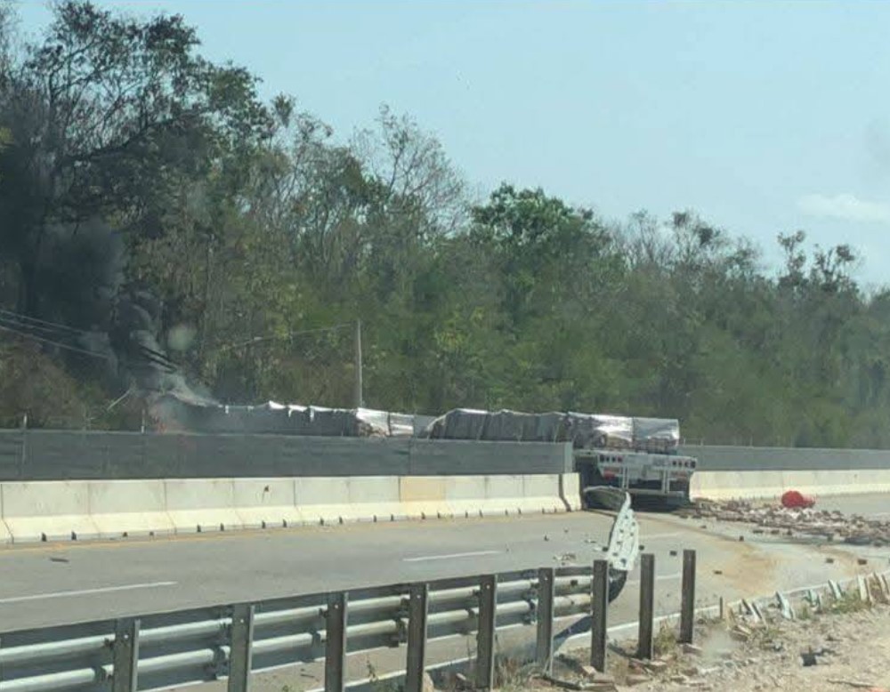 Mérida, Yucatán (Marcrix, Noticias).- Este domingo se registró un fuerte accidente en la autopista Mérida- Cancún, a la altura del kilómetro 86, rumbo a la caseta de cobro. Un tráiler de carga pesada chocó contra el muro de contención central, cruzó al carril contrario y terminó incendiándose, lo que provocó el cierre de ambos carriles.