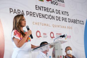 Durante un evento realizado en el parque Las Casitas de esta ciudad capital, la titular del Ejecutivo destacó la coordinación entre la Administración del Patrimonio de la Beneficencia Pública (APABEP) y la tenacidad de la presidenta honoraria del Sistema DIF Quintana Roo, Verónica Lezama, para diseñar este proyecto que convierte a la entidad en el primer estado de la república en realizar una Jornada de Prevención del Pie Diabético, donde el principal objetivo es capacitar y sensibilizar a los y las beneficiarias.
