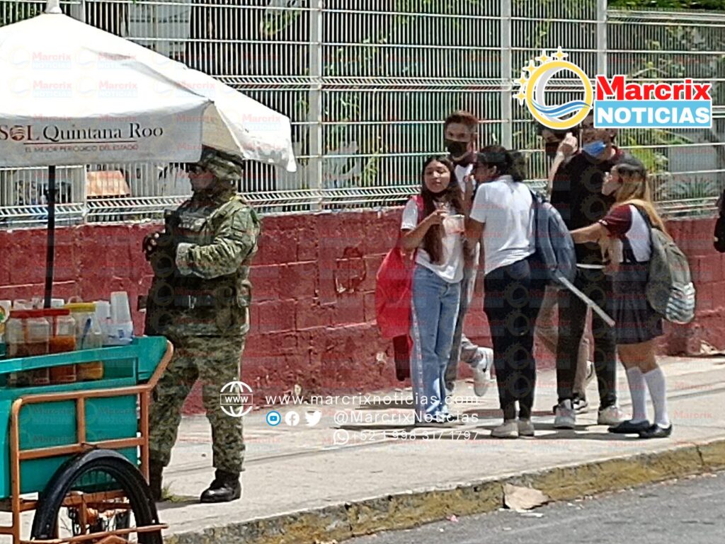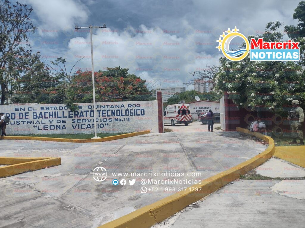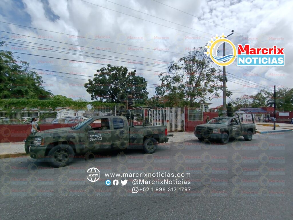 Cancún (Marcrix Noticias).- Elementos de la Secretaría de la Defensa Nacional (Sedena) se apostaron a las afueras del plantel educativo CBTIS 111, esto tras la amenaza de balacera hallada una anoche en un baño del centro educativo.