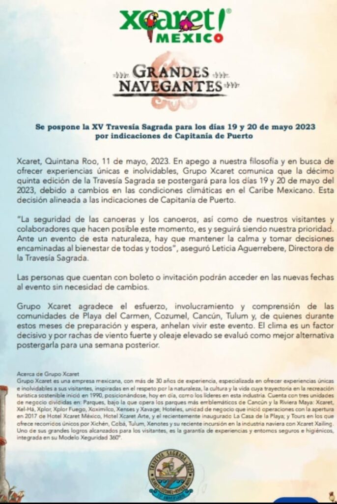 Detalló que por a instrucción de la Capitanía de Puerto, se pospone la XV Travesía Sagrada Maya, que ahora se llevará a cabo los días 19 y 20 de mayo del 2023.