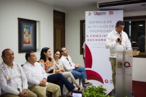 Más tarde, la Presidenta Municipal presenció la entrega de títulos de propiedad a habitantes de comunidades como Kuchumatán y Mayabalam, del municipio de Bacalar, en un acto encabezado por Mara Lezama en la Sala Cuna del Mestizaje, del Palacio de Gobierno.
