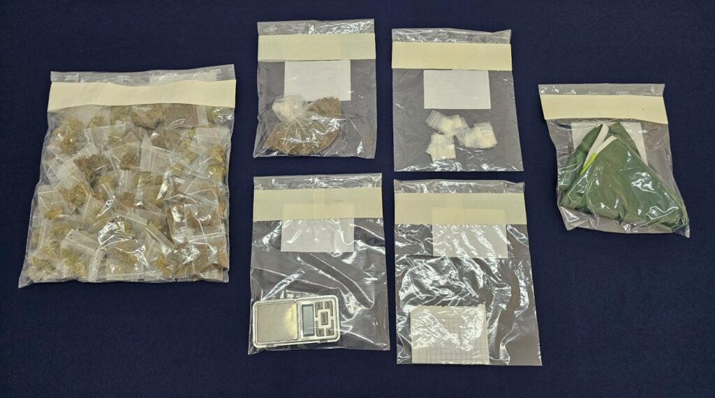 Al momento de la inspección se les decomisaron: 129 bolsitas de plástico transparentes tipo “ziploc” con vegetal seco de color verde oscuro con las características similares a la marihuana, 63 bolsitas de plástico transparente con fragmentos sólidos con las características similares al cristal. Además de un arma de fuego tipo corta color café oxidada, tipo subametralladora M11 AI calibre .380, con la leyenda “RPB industries, INC, Atlanta GA, U.S.A”, un cargador de color negro, con seis cartuchos de calibre 380 mm.