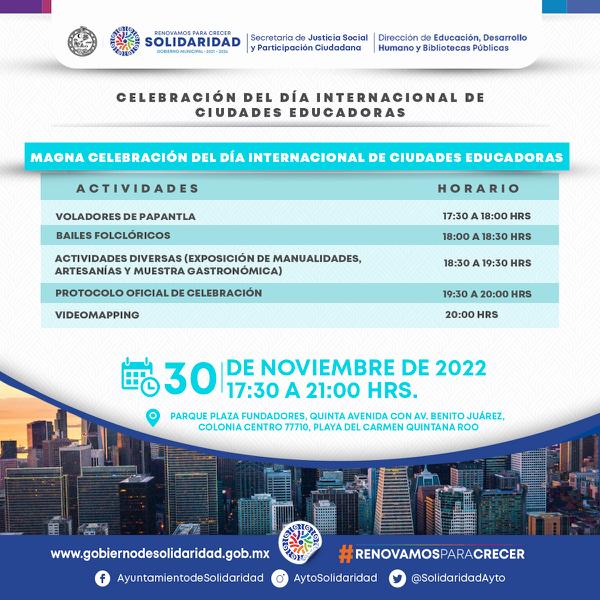 Playa del Carmen, Solidaridad, 27 de noviembre 2022.- Continuando con la atención a la educación, serán con tres días de festejos en distintas sedes, como el gobierno que encabeza Lili Campos celebrará la 32ª edición de Ciudades Educadoras, los próximos 28, 29 y 30 de noviembre.