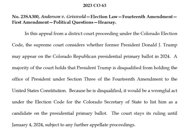“Una mayoría del tribunal sostiene que Trump está descalificado para ocupar el cargo de presidente en virtud de la Sección 3 de la 14ª Enmienda”, escribió la corte en su decisión de 4-3.