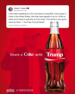 Washington D.C. (Marcrix Noticias).– El presidente de Estados Unidos, Donald Trump, aseguró que la empresa Coca-Cola aceptó su propuesta de reemplazar el jarabe de maíz de alta fructosa por azúcar de caña, en sus bebidas distribuidas dentro del país, lo que desató una fuerte polémica en el sector alimentario y entre productores agrícolas.