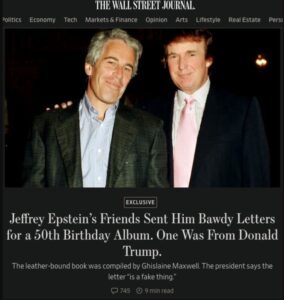 La querella fue presentada este viernes 18 de julio ante un tribunal federal en el distrito sur de Florida, un día después de que el diario estadounidense publicara un artículo que incluía una carta enviada a Epstein en 2003 por su cumpleaños número 50. Según The Wall Street Journal, la misiva contenía un dibujo de una mujer desnuda con el nombre “Donald” escrito sobre el vello púbico.