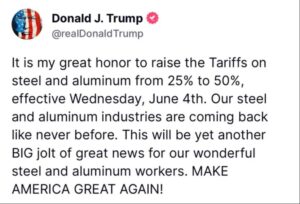 Next week, tariffs on steel will be raised from 25% to 50% to further protect the U.S. steel industry from foreign influence and unfair competition.
