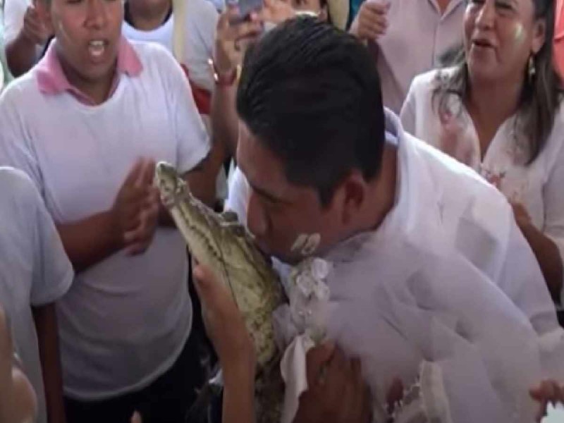 El alcalde de San Pedro Huamelula, Víctor Hugo Sosa, accedió a su petición en más de una ocasión durante la boda del jueves, agachándose para plantar sus labios en el hocico del pequeño cocodrilo, que había sido atado presumiblemente para evitar mordiscos indeseados.