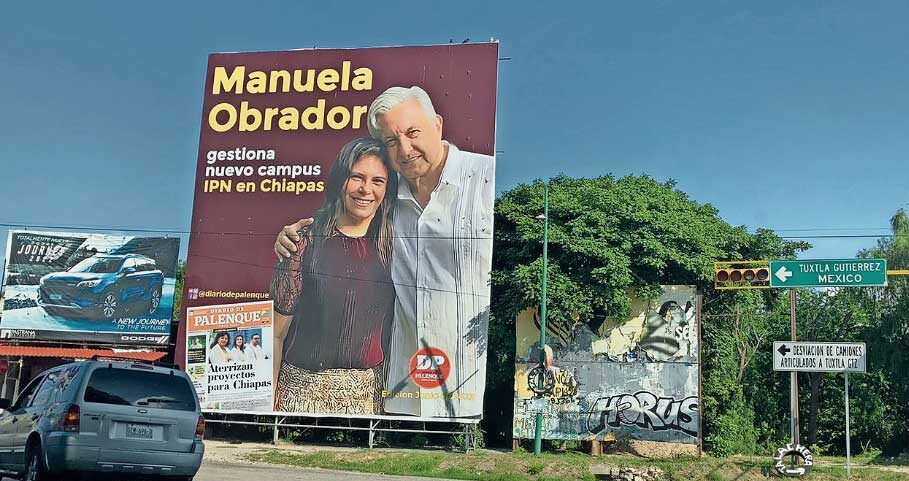 “Sólo del Aeropuerto de Tuxtla Gutiérrez al centro de la ciudad se exhiben tres espectaculares con el color de Morena, el título ‘Manuela Obrador gestiona nuevo campus del IPN’ y la portada de un periódico de Palenque, de donde es originaria. Usuarios de Twitter han difundido otros ubicados también en el estado”, afirmó el diario Reforma.