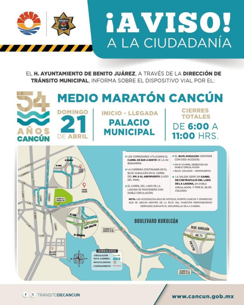 Este dispositivo empezará a operar el próximo domingo 21 de abril, en coordinación con ASDEPORTE y la Federación Mexicana de Triatlón AC, por lo que habrá cierres totales de las vialidades por donde se desarrollará este tradicional “Medio Maratón de Cancún”, serán de 6:00 a 11:00 horas.