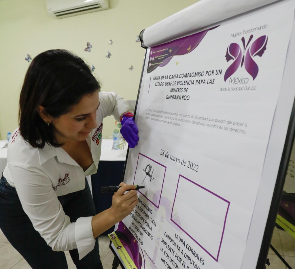 La Candidata de la Coalición Juntos Hacemos Historia, firmó este día junto con Laura Corrales, Candidata suplente, la “Carta compromiso por un estado libre de violencia para las mujeres de Quintana Roo”, que impulsan las organizaciones civiles “Mujeres transformando México desde la sociedad AC” y el movimiento “Mariposas Asociación Civil”, con el objetivo de contribuir a erradicar la violencia y desigualdad contra las mujeres.