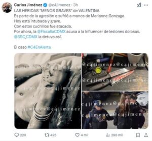 Tras el ataque, Valentina fue trasladada de emergencia al Hospital Médica Sur en Tlalpan, donde permanece en coma inducido bajo observación en la unidad de terapia intensiva.
