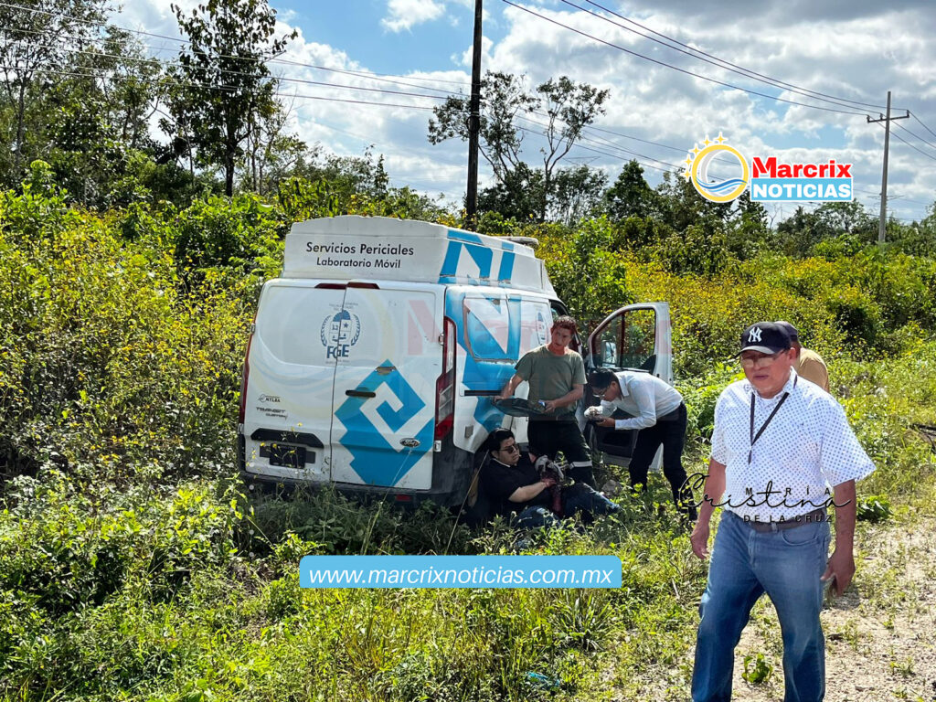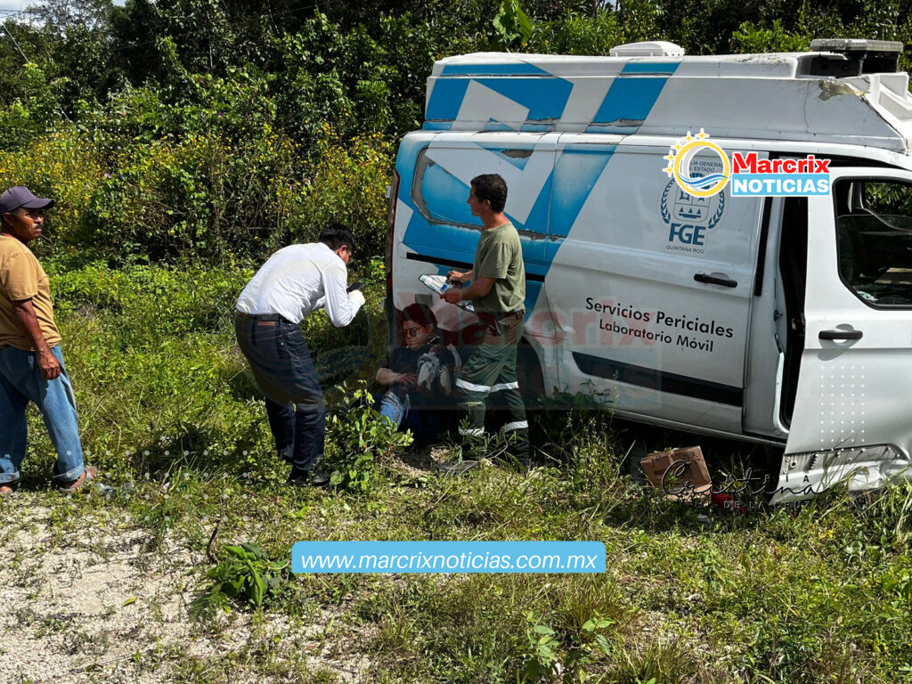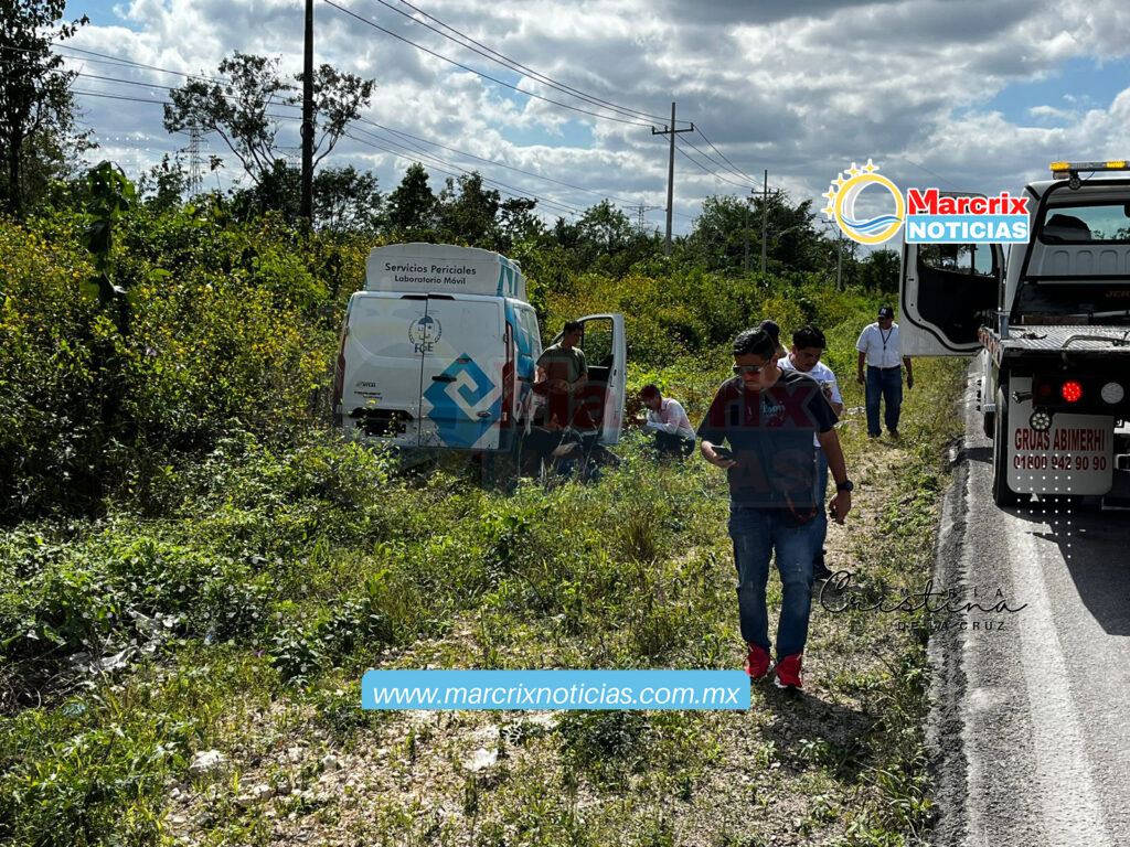 Tras sufrir la volcadura, la Van de la Fiscalía se salió de la carpeta asfáltica, donde terminó entre la maleza y retomó su posición normal.