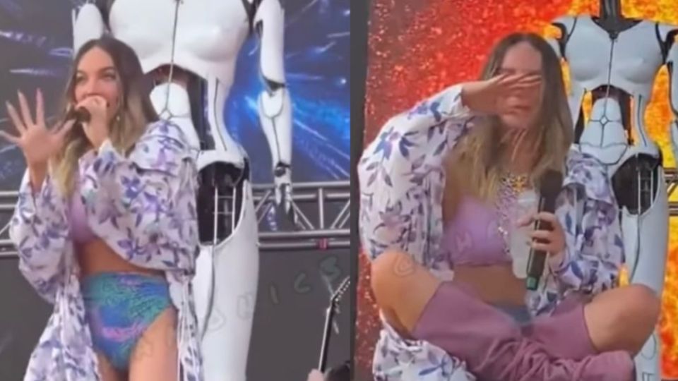 En el video compartido en redes sociales, se le puede ver a Belinda sentada en una orilla del escenario mientras se hidratan y el público le ayudaba cantando.