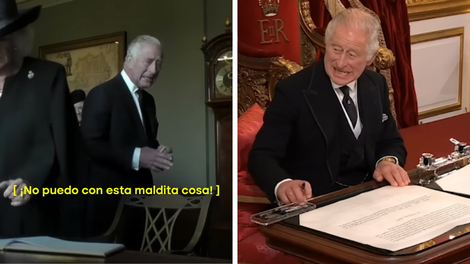 El enfado de Carlos III había empezado unos segundos antes, cuando se da cuenta de que ha firmado con una fecha equivocada. Exasperado, el monarca abandona la sala sin esperar a Camila, reina consorte, que todavía debe estampar su rúbrica en el documento.