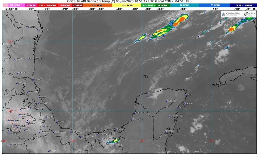La masa de aire frío que impulsa al frente provocará viento fresco y arrachado del norte y noreste sobre la región peninsular, así como incremento en los nublados con lluvias acompañadas de actividad eléctrica, temperaturas frescas durante la noche y madrugada principalmente en la zona norte del Estado y calurosas durante el día en la mayor parte de Quintana Roo.