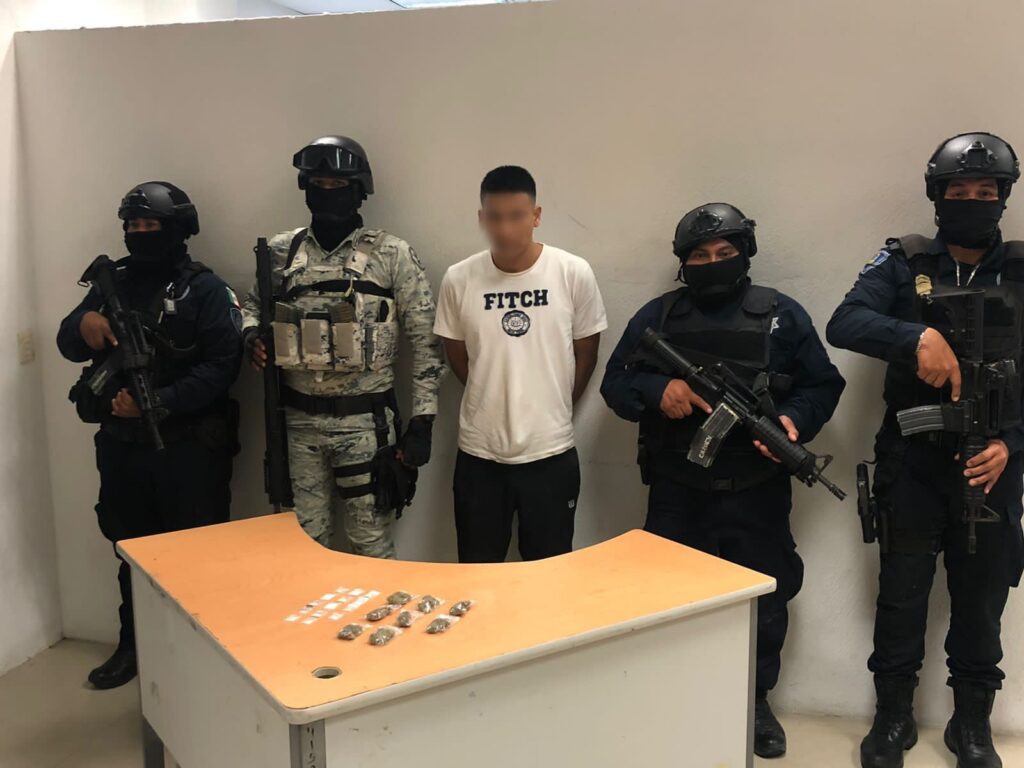 En otro recorrido y ejercicio de inteligencia para la construcción de la Paz en Tulum, se logró la detención de Arturo “N” de 28 años, originario de Querétaro. A él se le detectó y aseguró 15 bolsas de presunta cocaína y 8 de marihuana.