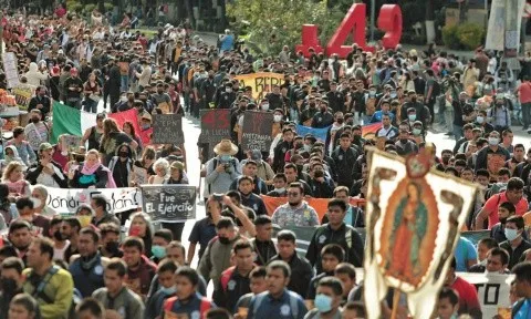 Al grito de “vivos se los llevaron, vivos los queremos” se conmemoró el octavo aniversario de la desaparición de los 43 estudiantes de la Escuela Normal Rural de Ayotzinapa.