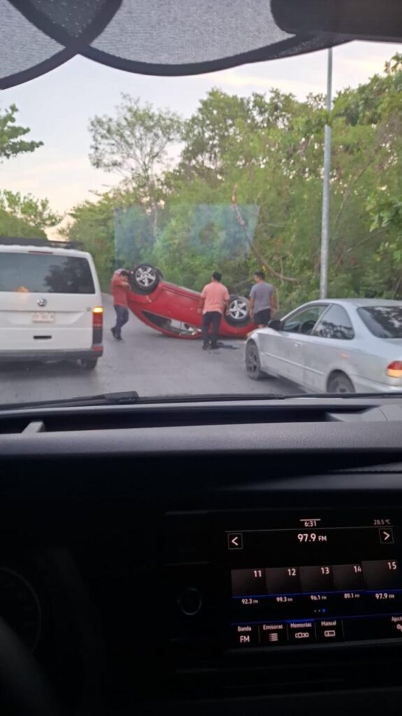 La volcadura de un automóvil color rojo causó intenso tráfico en Costa Mujeres, Cancún